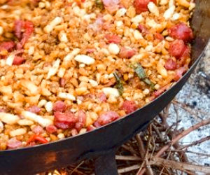 When all is done, pour in the migas and paprika (one or two tablespoons, to taste), stir, salt to taste, and moisten with small amounts of water while you stir. Migas should be loose and not too soaked in liquid.