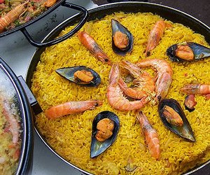The authentic Spanish paella, therefore, is the Valencian paella. However most Spaniards who aren’t Valencians, and of course the vast majority of foreigners who think of paellas, have an image in their minds of the typical seafood paella. This is a derivation of Valencian paella and is very popular, especially in Andalusia in southern Spain, which is made with a similar base, but using varied seafood as main ingredients: prawns, mussels, clams, squid, etc.